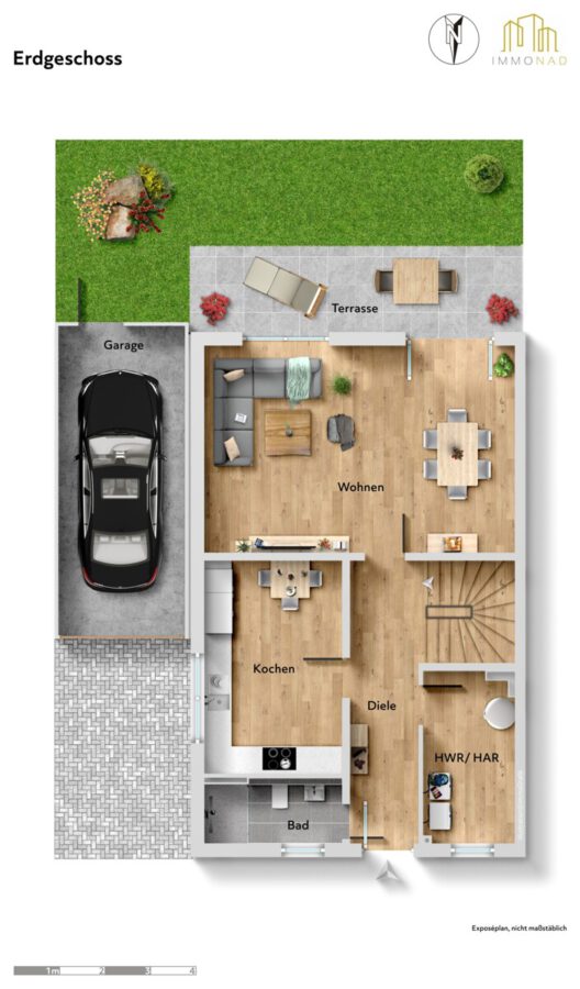 Sämtliche Angaben zu diesem Objekt dienen einer ersten Information. Das Exposé zu diesem Angebot und die darin gemachten Angaben in Wort, Bild und Werten stellen keine Beschaffenheitsvereinbarung dar. Wert- und Maßangaben sind lediglich ca.-Werte. IMMONAD GmbH übernimmt keine Haftung für die vorliegenden Angaben. Die Aufteilung entnehmen Sie bitte den beigefügten Grundrissskizzen und Visualisierungen (unverbindliche Illustration).