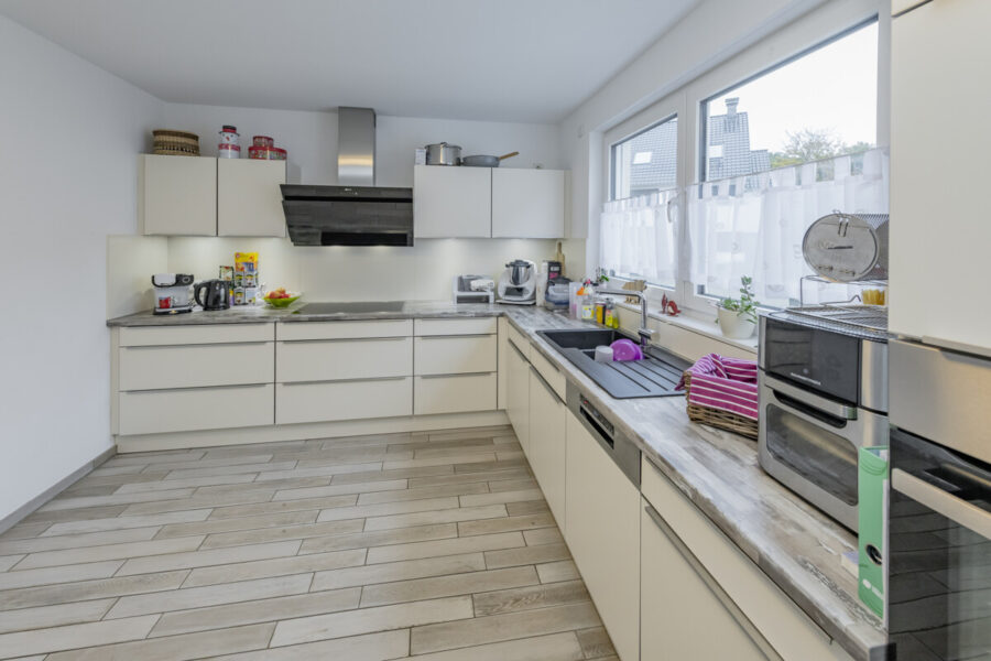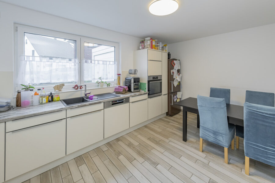 Vom Wohnbereich aus gelangen Sie direkt auf die im Jahr 2019 neu gepflasterte Terrasse und in den liebevoll angelegten Garten. Hier können Sie an sonnigen Tagen frühstücken und den Abend in entspannter Atmosphäre mit Ihrer Familie ausklingen lassen. Die Küche bietet ausreichend Platz für einen Esstisch mit vier Stühlen und schafft mit ihrer durchdachten Aufteilung einen gemütlichen Ort für gemeinsame Mahlzeiten und Gespräche.