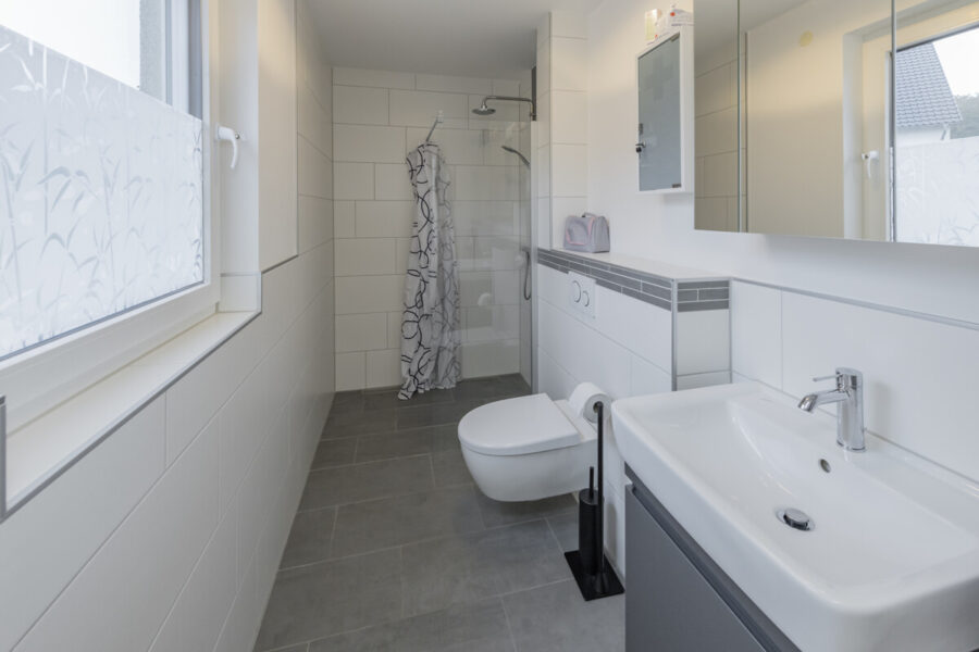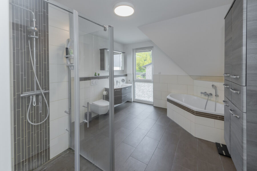 - Zwei moderne Bäder, jeweils mit ebenerdiger Dusche, im Familienbad zusätzlich mit Badewanne