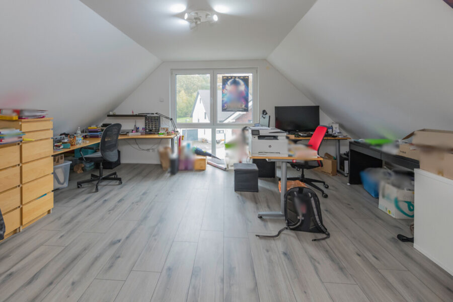 Der ausgebaute Dachboden erweitert das Raumangebot und eignet sich hervorragend als Hobbyraum, Homeoffice oder Rückzugsort. Aktuell bietet dieser Bereich Platz für zwei komfortable Arbeitsplätze und ermöglicht konzentriertes und ruhiges Arbeiten, ideal für das moderne Familienleben.