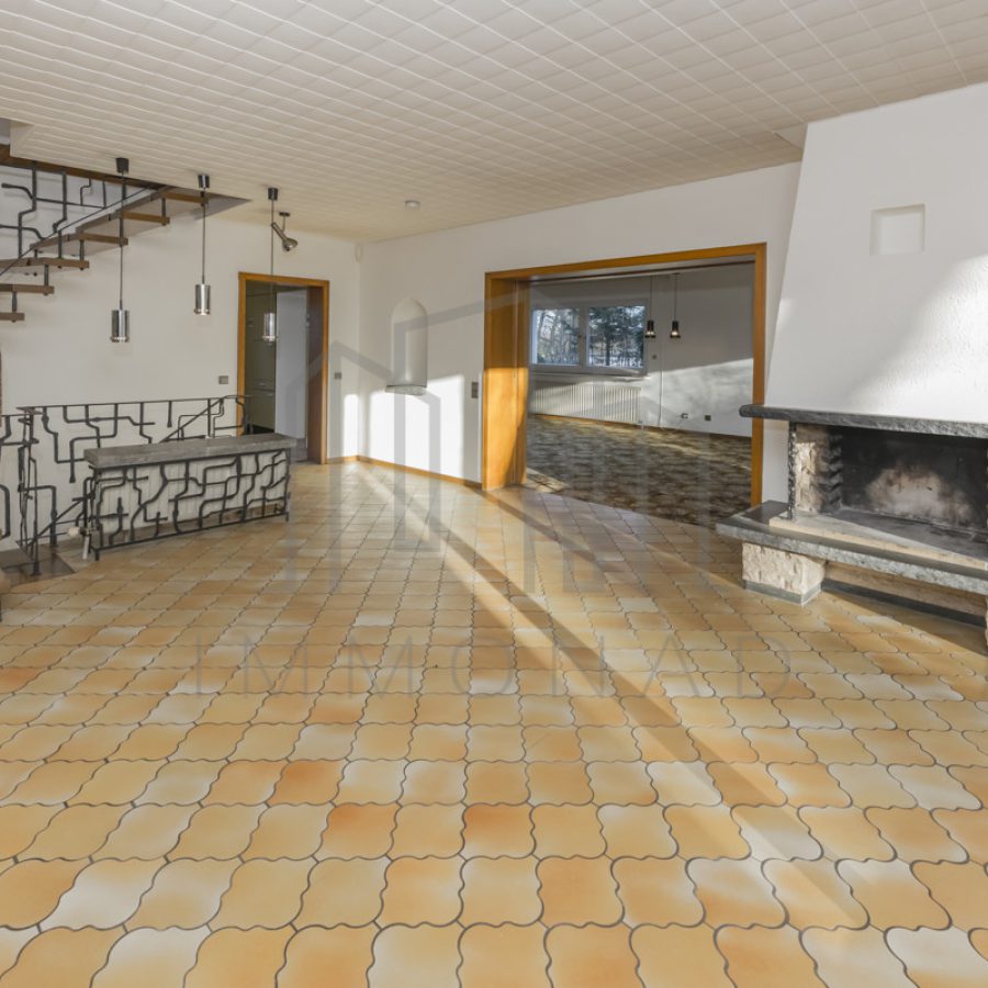 Durch die imposante, kupferbeschlagene Holztür betreten Sie den großzügigen Windfang. Von hier aus erreichen Sie das Gäste-WC und eine weitläufige Diele, in der ein stilvoller Kamin für behagliche Stimmung sorgt. In der Diele gelangen Sie auch zur überdachten Terrasse – ideal ergänzt durch eine zusätzliche Markise, die vor Sonne und Witterung schützt.