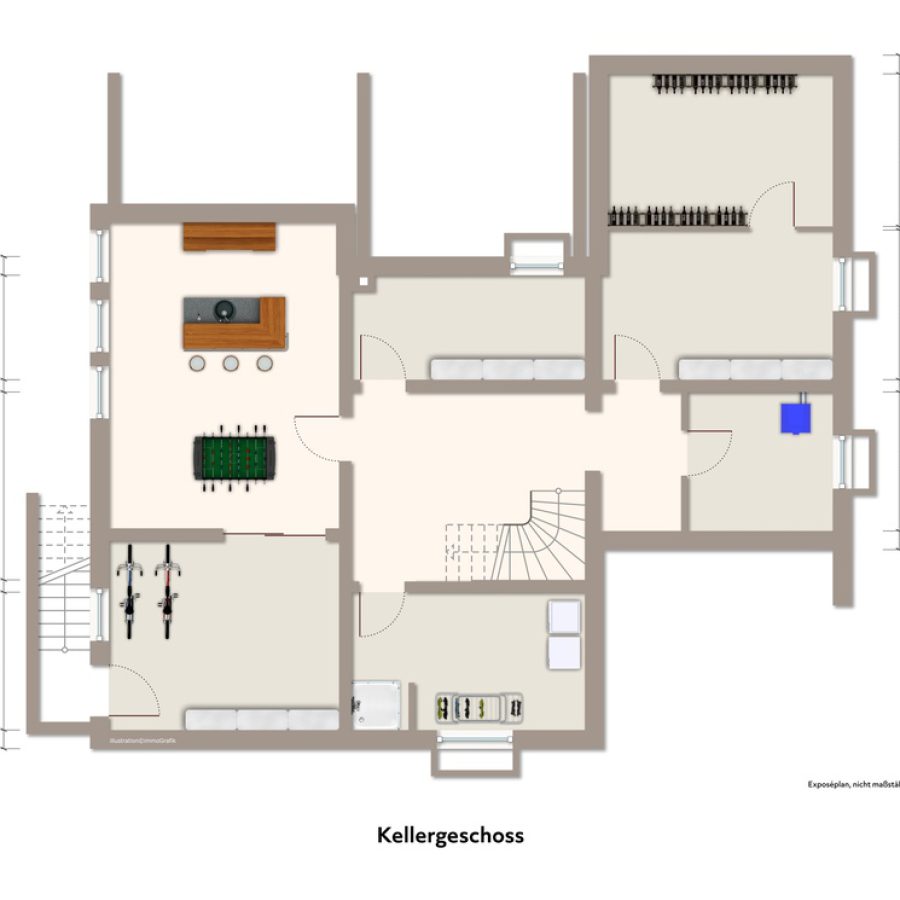 Der Keller überzeugt mit einem durchdachten Grundriss und zahlreichen Nutzungsmöglichkeiten. Neben Vorrats-, Heizungs-, Wasch- und Trockenräumen finden Sie hier einen Weinkeller sowie einen großzügigen Partyraum, der sich ideal für gesellige Stunden eignet. Ein weiterer Raum ermöglicht direkten Zugang in den sorgfältig angelegten Garten.