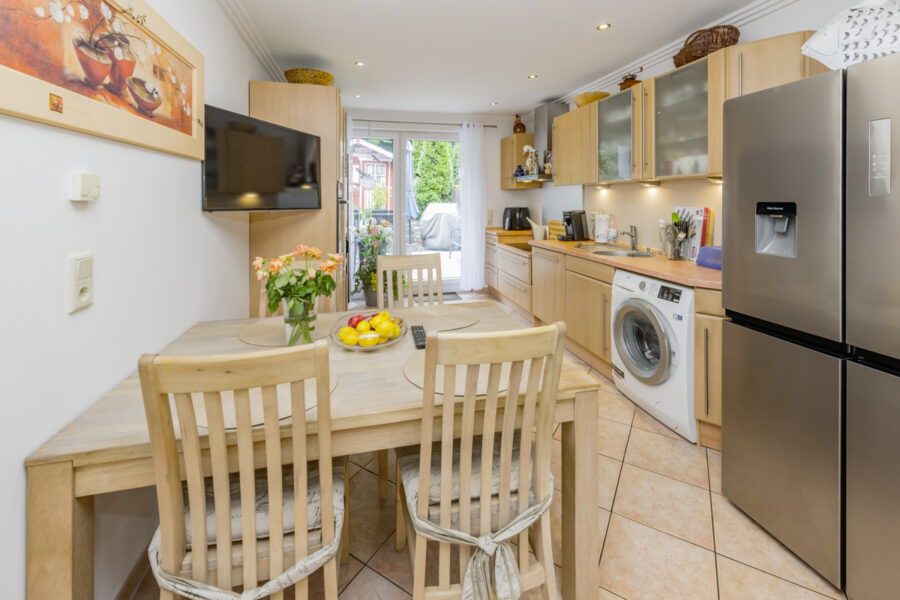 Das Haupthaus überzeugt bereits beim Betreten durch seine durchdachte Aufteilung. Die helle Diele empfängt Sie mit offenem Charakter – zur linken Seite befindet sich ein modernes Gäste-WC. Geradeaus eröffnet sich der großzügige Wohn- und Essbereich mit angenehmer Verbindung zur offen gestalteten Küche. Diese wurde bewusst halboffen gehalten, um Kommunikation und Rückzug gleichermaßen zu ermöglichen – ein perfektes Zusammenspiel aus Design und Alltagstauglichkeit. Wandöffnungen mit integrierten Leuchtelementen unterstreichen das stilvolle Raumgefühl. Große Fensterflächen schaffen eine freundliche Wohnatmosphäre und führen auf die angrenzende Terrasse mit gepflegtem Garten. Ob Frühstück unter freiem Himmel, Spielzeit mit den Kindern oder gesellige Sommerabende – dieser Bereich lädt zu entspannten Stunden im Freien ein. Ein charmantes Gerätehäuschen und liebevoller Baumbestand runden das Gesamtbild ab.