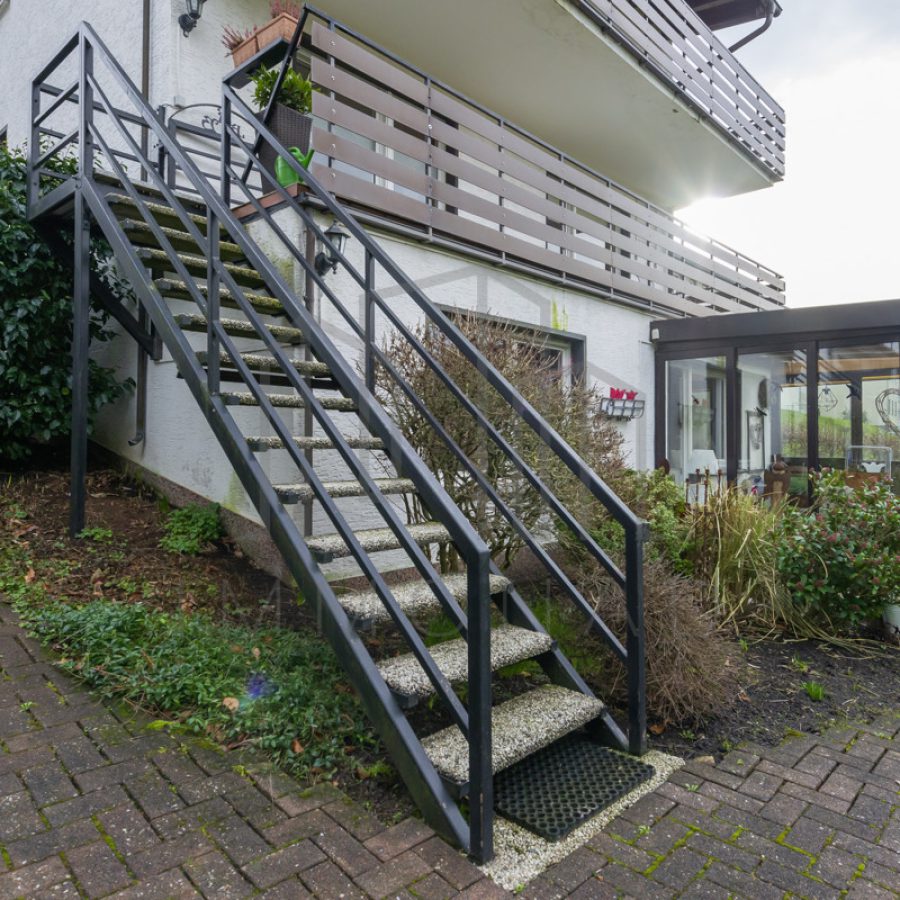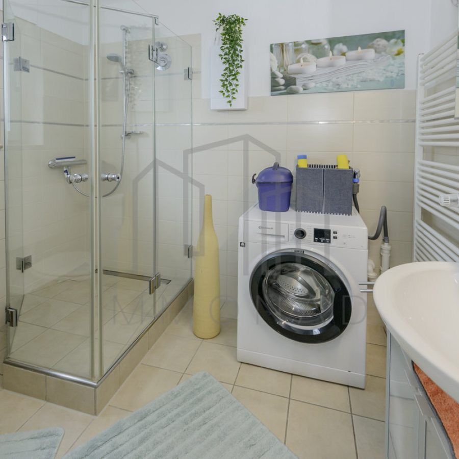 Die untere Etage beherbergt das Elternschlafzimmer, das Hauptbadezimmer und zwei Kinderzimmer. Das Badezimmer verfügt über eine Dusche, einem Dusch-WC, ein Waschbecken und ein Fenster. Die Renovierung fand im Jahr 2000 statt. Sowohl vom Elternschlafzimmer als auch von einem der Kinderzimmer gelangen Sie auf einen weiteren großen Balkon. Eine Treppe führt direkt vom Balkon in den Garten. Von der Diele aus gelangt man zum Wasch- und Trockenkeller, zum Vorratskeller und zu einem weiteren Highlight, dem Fitnessraum. Nach dem Workout können Sie sich in der Infrarotkabine entspannen. Die Garage ist entweder durch das Tor oder durch den Keller zugänglich.