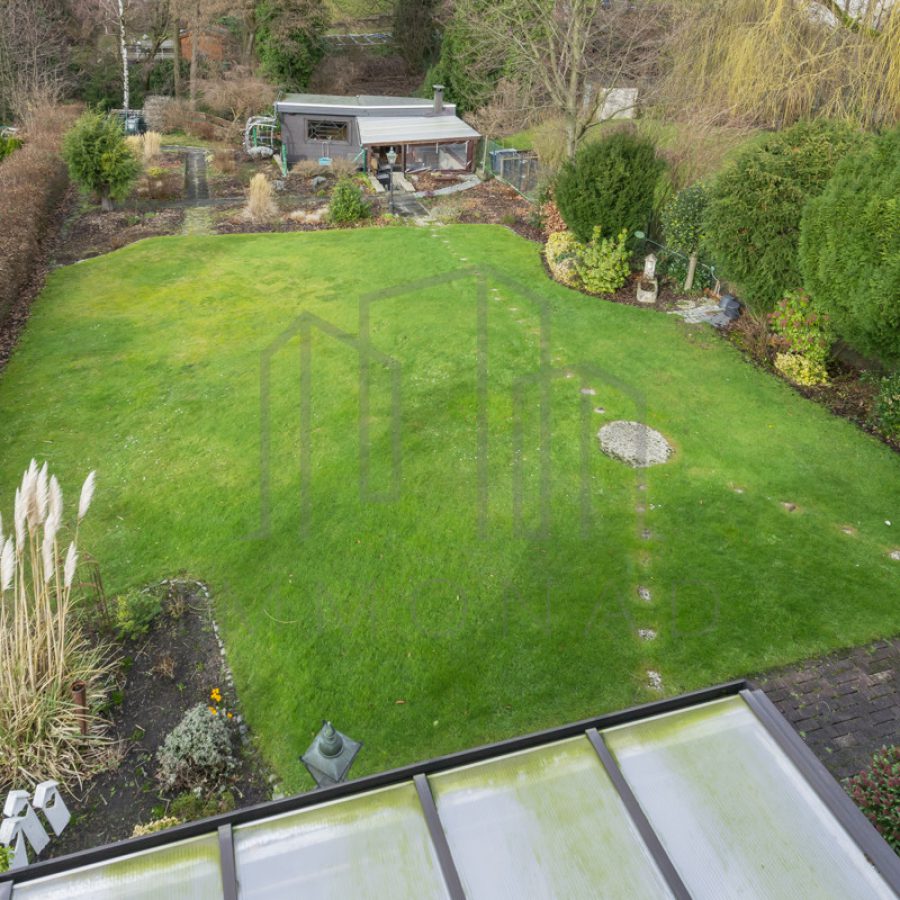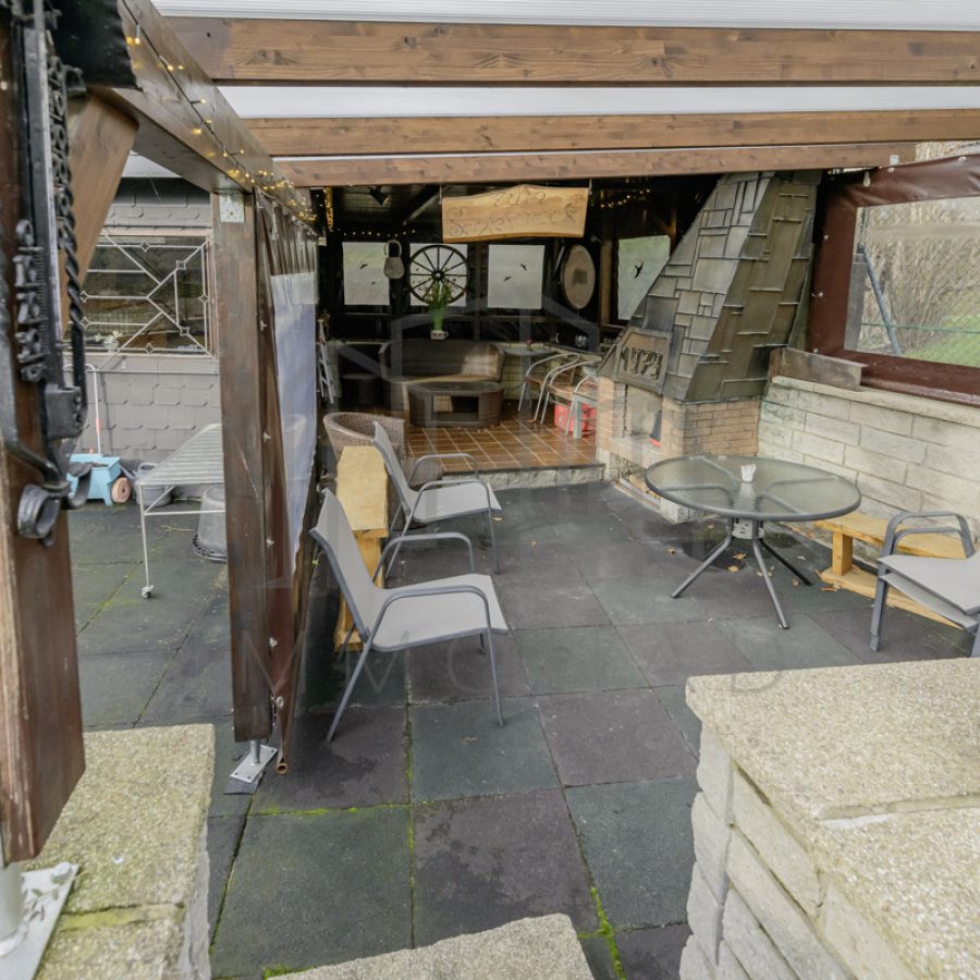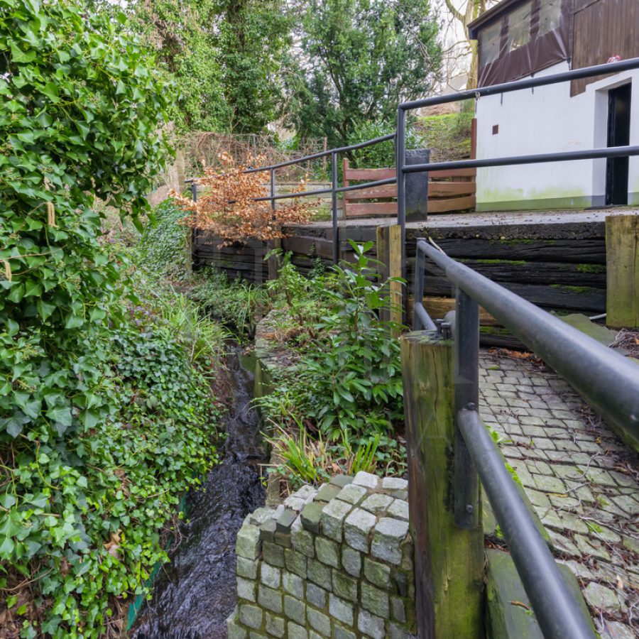 Dieses Haus erstreckt sich über mehrere Ebenen, die Sie durch die Diele betreten. Dort finden Sie ein geräumiges Arbeitszimmer, eine stilvolle Garderobe und ein einladendes Gäste-WC. Ein paar Treppenstufen höher erwartet Sie ein atemberaubendes Wohnzimmer, dessen schön verzierte Decke mit integrierten Spots besticht. Die offene Küche wird derzeit durch einen praktischen Schrank geteilt und um Gerüche fernzuhalten, können Sie diese mit einer stilvollen Schiebetür verschließen. Vom Wohnzimmer aus gelangen Sie auf den großzügigen Balkon der oberen Etage, von dem aus Sie einen fantastischen Blick auf den Garten haben. Dort sehen Sie bereits einige der Highlights, die Sie erwarten, wie das Gartenhaus mit Grill und Werkstatt mit Toilette sowie den atemberaubenden Bachlauf.
