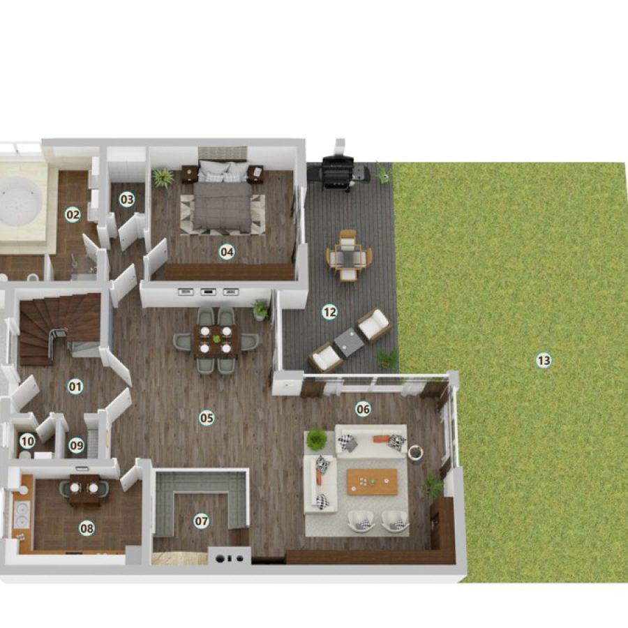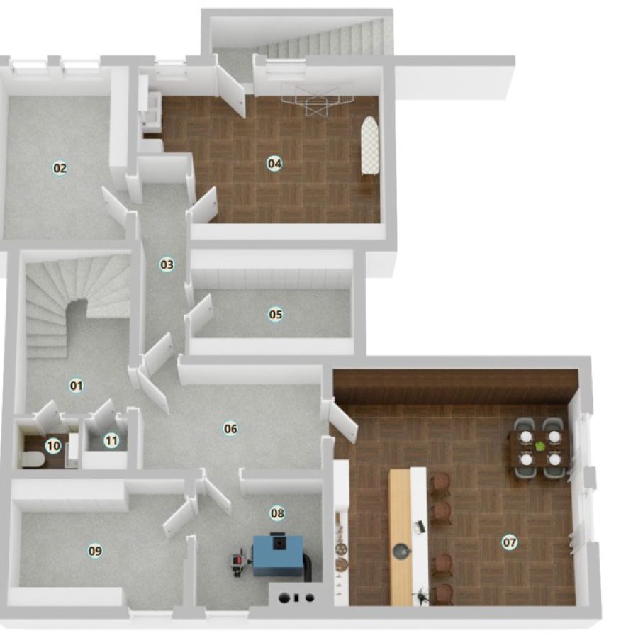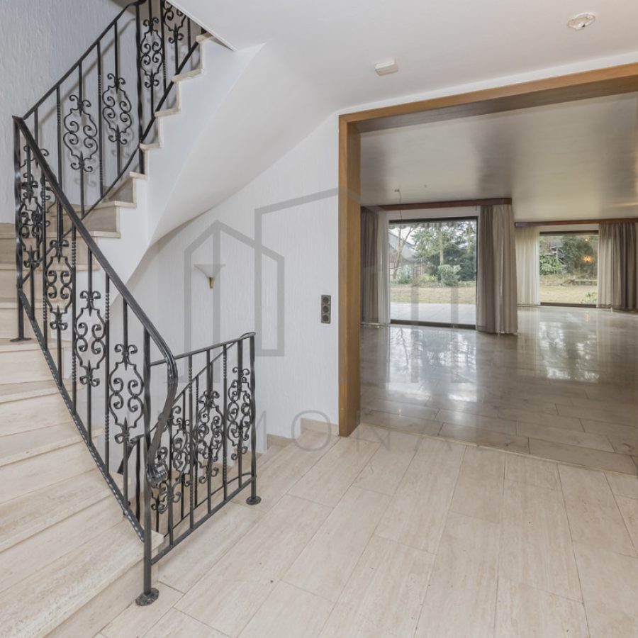Der freundliche Eingangsbereich begrüßt Sie und Ihre Gäste mit einem Gäste-WC sowie einer dekorativen Garderobe, in der sich eine der Steuerungen für die Fußbodenheizung befindet – ideal für einen praktischen Empfang. Durch die große Doppeltür gelangen Sie in das einladende Wohn- und Esszimmer, das den zentralen Treffpunkt für die ganze Familie bildet. Hier können Sie gemeinsam Zeit verbringen, lachen und schöne Abende genießen. Vom Wohnzimmer aus erreichen Sie den weitläufigen Garten, der zahlreiche Möglichkeiten für Spiel und Spaß im Freien bietet. Eine tiefergelegene Kaminecke im Wohnzimmer sorgt für Gemütlichkeit.