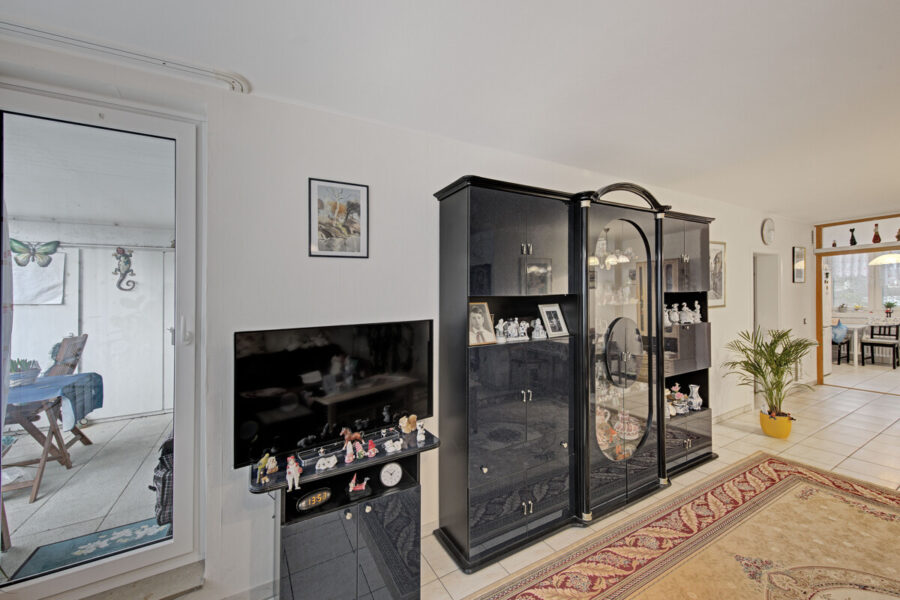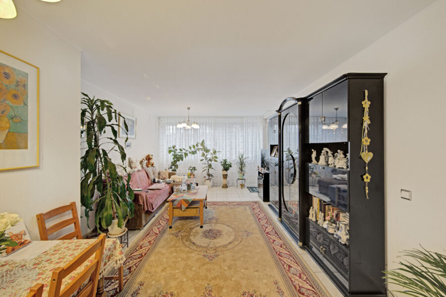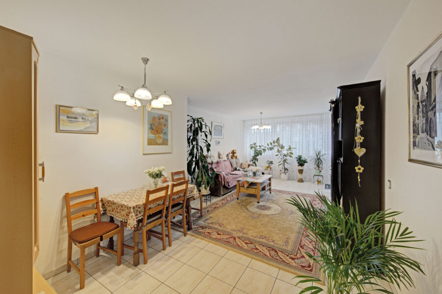 Die insgesamt drei Zimmer verteilen sich auf ein großzügiges Wohnzimmer, ein Schlafzimmer, eine separate Küche sowie ein weiteres Zimmer, das flexibel als Kinder-, Arbeits- oder Gästezimmer genutzt werden kann. Große Fensterflächen sorgen für eine helle und freundliche Atmosphäre in allen Wohnräumen.