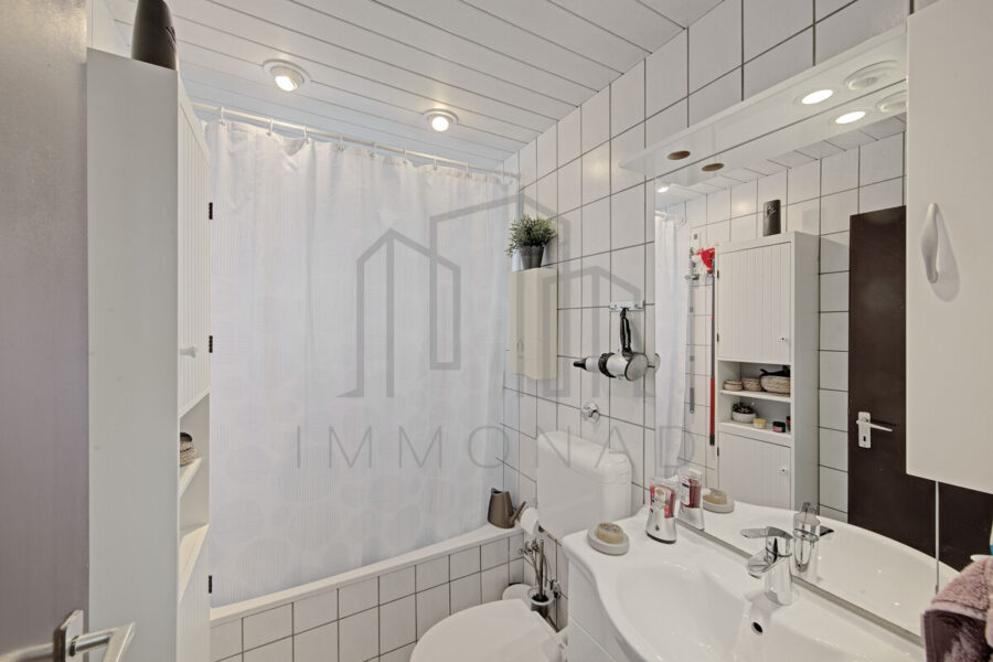 Das innenliegende Badezimmer ist deckenhoch hell gefliest und mit Badewanne, Waschbecken und WC ausgestattet. LED-Deckenspots verleihen dem Raum ein modernes Erscheinungsbild, die Warmwasserversorgung über einen Durchlauferhitzer entspricht heutigen Standards.