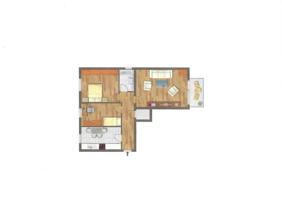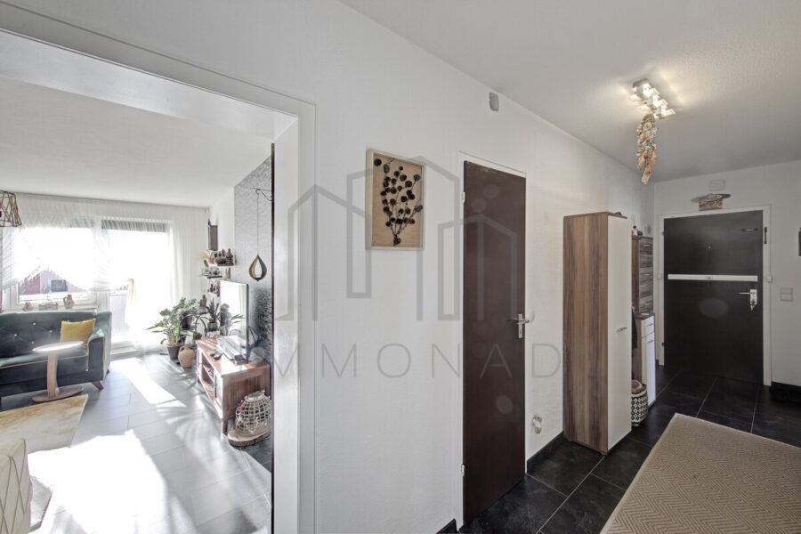 Über die großzügige Diele sind alle Räume bequem erreichbar. Das helle, großzügige Wohnzimmer bildet das Herzstück der Wohnung und bietet direkten Zugang zum Balkon mit – ein Ort für entspannte Stunden im Freien.
