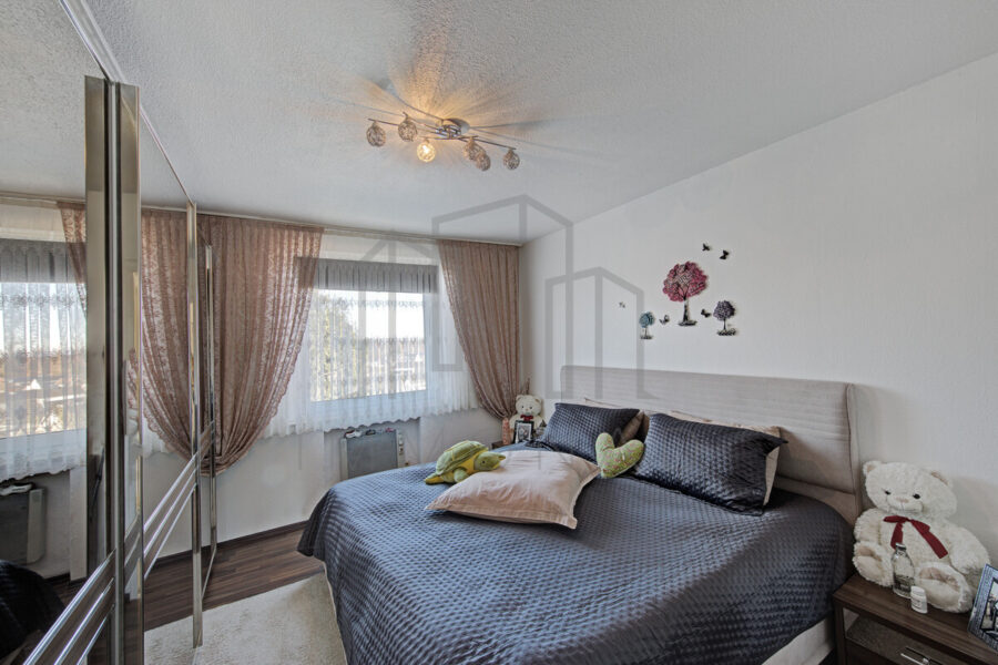 Das Schlafzimmer mit großem Fenster sorgt für eine angenehme Wohnatmosphäre und ist mit Laminatboden ausgestattet. Ein weiteres Zimmer lässt sich flexibel als Kinder-, Arbeits- oder Gästezimmer nutzen.