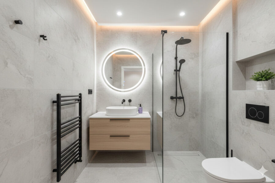 Das Schlafzimmer liegt auf der rechten Seite und verfügt über ein Bad en suite, wodurch ein privater Rückzugsbereich mit hohem Wohnkomfort entsteht. Diese Lösung verleiht der Wohnung eine klare Struktur und unterstreicht den angenehmen, wohnlichen Charakter.