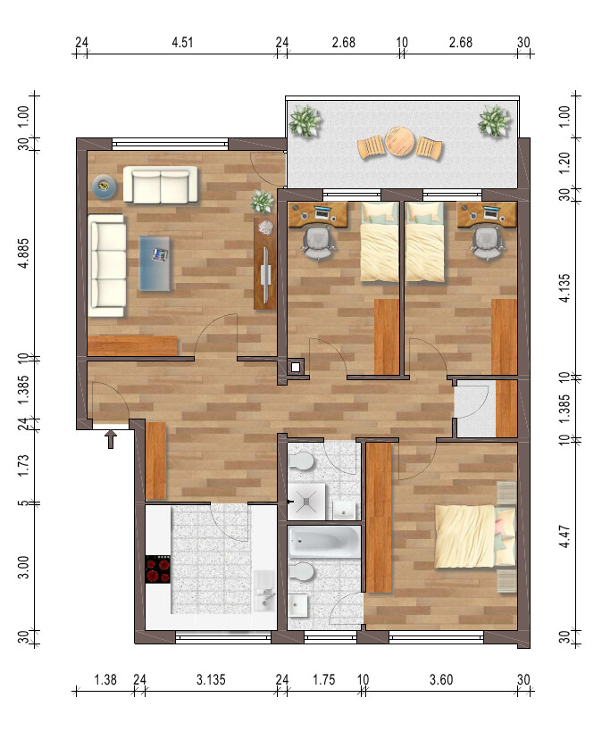 Links der Diele befindet sich das sehr großzügige Wohnzimmer, das durch seine Größe vielfältige Einrichtungsmöglichkeiten eröffnet. Der direkte Zugang zum Balkon erweitert den Wohnbereich nach außen und bietet einen angenehmen Ort für entspannte Stunden im Freien. Im hinteren Bereich der Wohnung setzt sich die klare Raumstruktur fort: Auf der rechten Seite liegt ein Duschbad, links ein flexibel nutzbares Zimmer, das sich ideal als Arbeits-, Kinder- oder Gästezimmer eignet. Ein weiteres Zimmer befindet sich weiter geradeaus auf der linken Seite und bietet ebenfalls zahlreiche Nutzungsmöglichkeiten – etwa als zusätzliches Kinderzimmer, Homeoffice oder Hobbyraum. Ein praktischer Abstellraum sorgt für wertvollen Stauraum im Alltag.