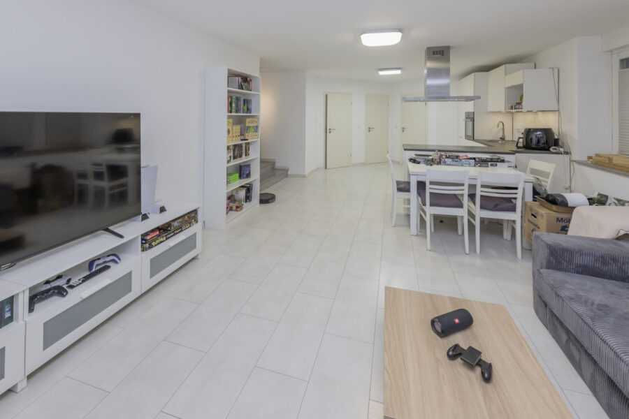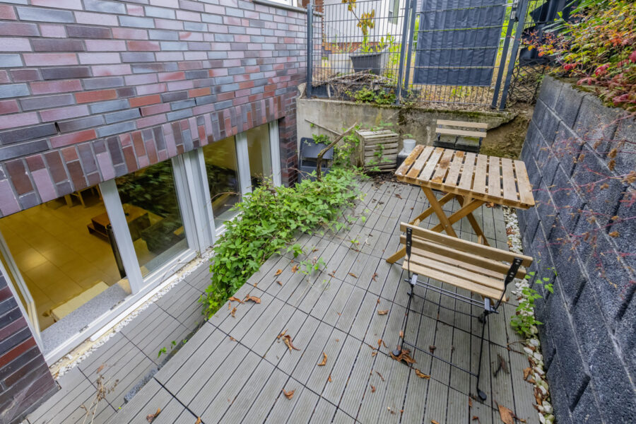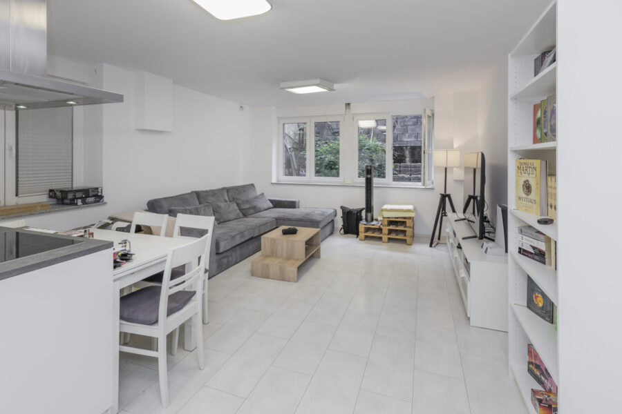 Der offen gestaltete Wohn- und Essbereich mit integrierter Einbauküche bildet das Herzstück der Wohnung. Die Küche ist im Kaufpreis bereits enthalten. Von hier aus geht es direkt auf die eigene kleine Terrasse – perfekt, um den Morgenkaffee draußen zu genießen oder abends entspannt frische Luft zu schnappen. Ein eigenes Törchen führt direkt ins Freie.