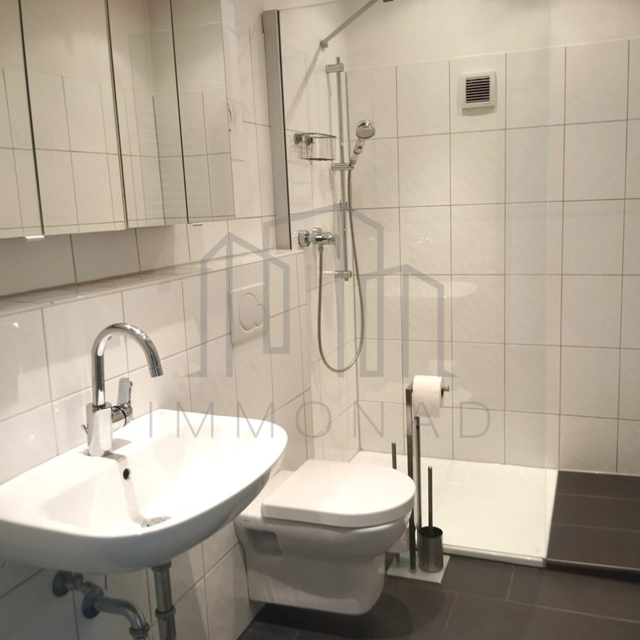Beim Betreten der Wohnung führt ein länglicher Flur direkt zu Schlafzimmer, Badezimmer und Küche. Das Schlafzimmer bietet viel Platz für ein großes Bett und einen Kleiderschrank. Direkt gegenüber liegt das moderne Badezimmer – ausgestattet mit bodengleicher Dusche, wandhängendem WC, Waschbecken, Spiegelschrank und Handtuchheizkörper. Die abgehängte Decke mit integrierter LED-Beleuchtung sorgt für stimmungsvolles Licht und unterstreicht das zeitgemäße Design.
