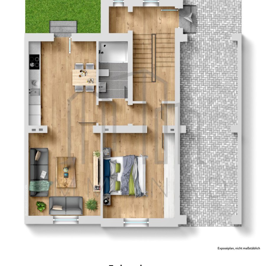 Das Exposé zu diesem Angebot und die darin gemachten Angaben in Wort, Bild und Werten stellen keine Beschaffenheitsvereinbarung dar. Die Aufteilung entnehmen Sie bitte den beigefügten Grundrissskizzen (unverbindliche Illustration).