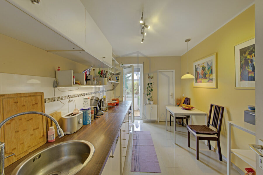 Die funktionale Küche mit angrenzender Abstellkammer und der überdachte Balkon mit Zugang zum gemeinschaftlich genutzten Garten schaffen zusätzlichen Komfort und Lebensqualität.