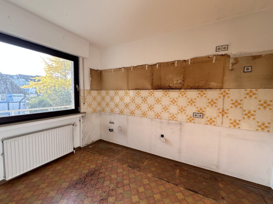 Die Küche ist ein heller Raum mit großem Fenster. Der Boden wird vor dem Einzug noch erneuert. Anschlüsse für Herd, Spüle und Waschmaschine sind vorhanden, sodass die zukünftigen Mieter ihre eigene Einbauküche nach Wunsch einrichten können.