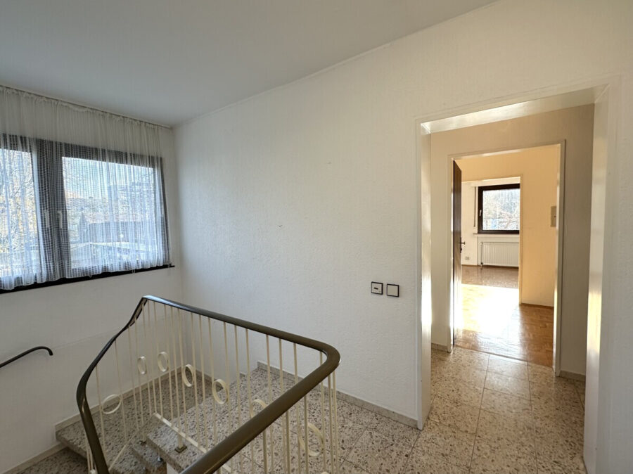 Über das gepflegte Treppenhaus mit stabilem Metallgeländer gelangen Sie bequem zur Wohnung im Obergeschoss. Zur Wohnung gehört ein großer Doppelkeller, der reichlich Stauraum für Vorräte, Fahrräder oder saisonale Gegenstände bietet.