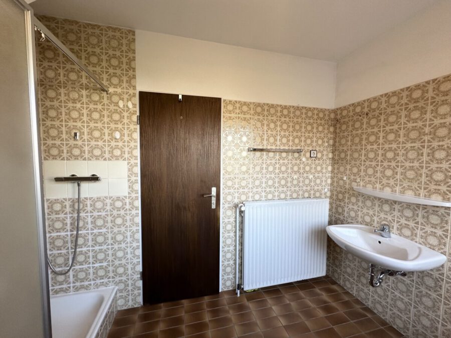 Das Badezimmer verfügt über eine Badewanne und eine separate Dusche. Ein großes Fenster sorgt für Tageslicht und gute Belüftung. Die Fliesen im Retro-Stil verleihen dem Raum einen besonderen Charme.