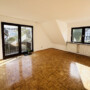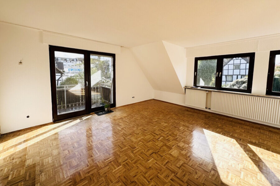 Das Wohnzimmer ist großzügig geschnitten und sehr hell. Große Fenster lassen viel Tageslicht herein, und von hier aus gelangen Sie auf den Balkon, der sich über die Hausseite erstreckt. Der Blick ins Grüne und die ruhige Umgebung laden dazu ein, die Sonne zu genießen oder den Tag entspannt ausklingen zu lassen.