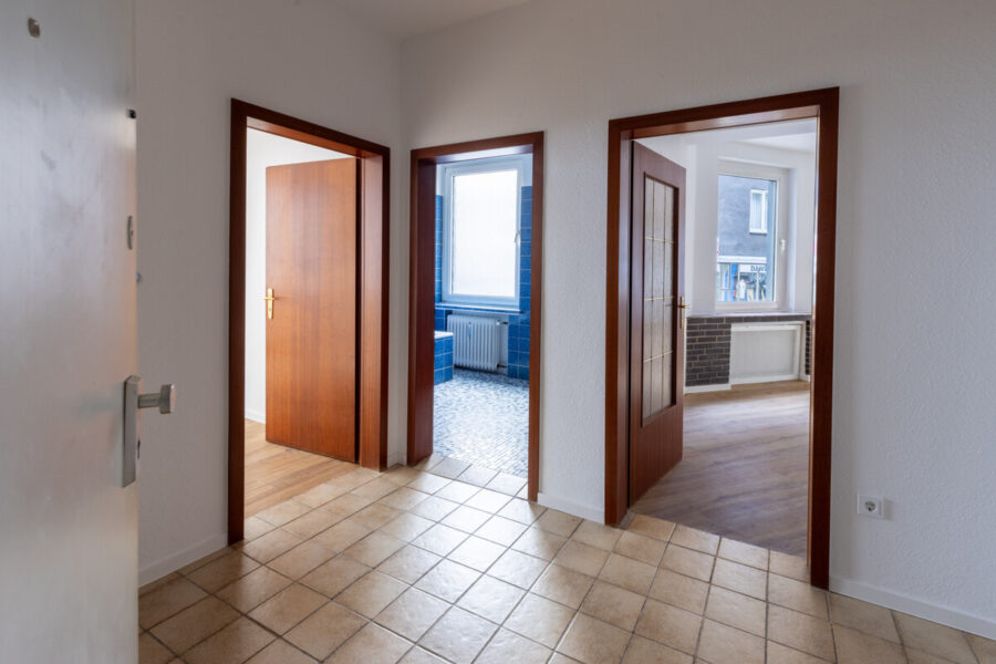 Der zentral gelegene Flur verfügt über einen pflegeleichten Fliesenboden; seine klare Struktur macht ihn zu einem praktischen Eingangsbereich mit ausreichend Platz für Garderobe oder Schuhschrank.