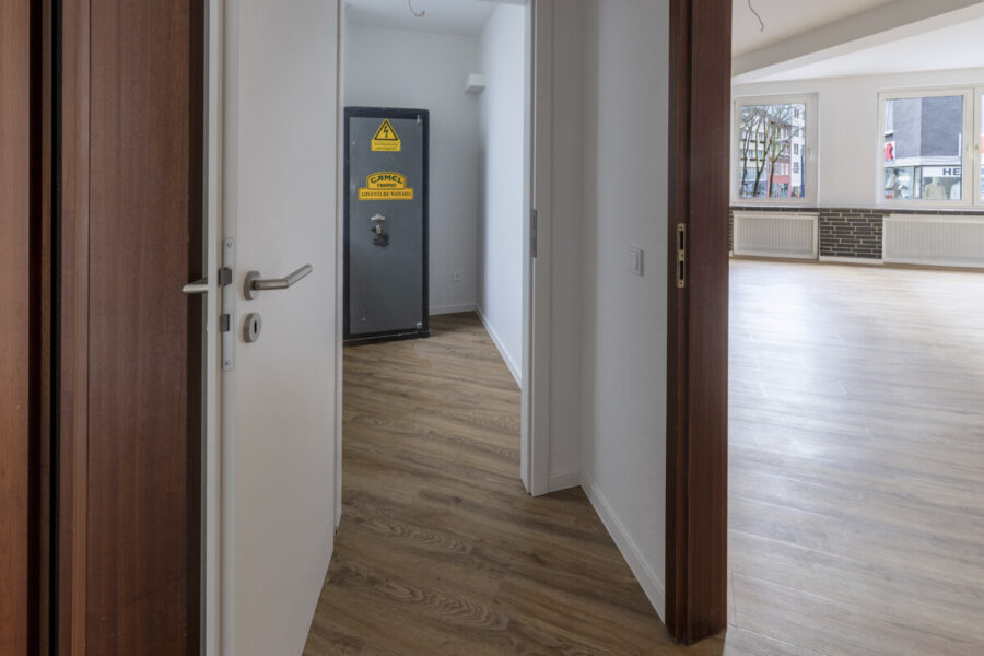 Der weitläufige Wohnbereich besticht durch seine großzügige Fensterfront mit Blick auf die belebte Straße. Der helle Laminatboden in Holzoptik und die umlaufenden Heizkörpernischen mit dunkler Klinkeroptik verleihen dem Raum einen modernen Loft-Charakter. Die offene Gestaltung bietet vielfältige Nutzungsmöglichkeiten – ideal als kombinierter Wohn- und Essbereich oder für ein offenes Arbeitskonzept.