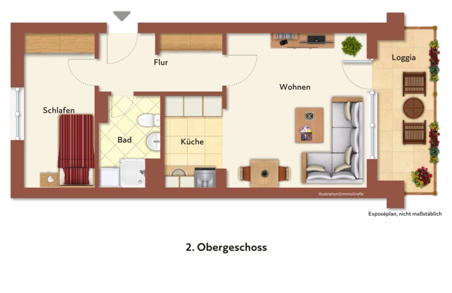 Das Exposé zu diesem Angebot und die darin gemachten Angaben in Wort, Bild und Werten stellen keine Beschaffenheitsvereinbarung dar. Die Aufteilung entnehmen Sie bitte den beigefügten Grundrissskizzen (unverbindliche Illustration).