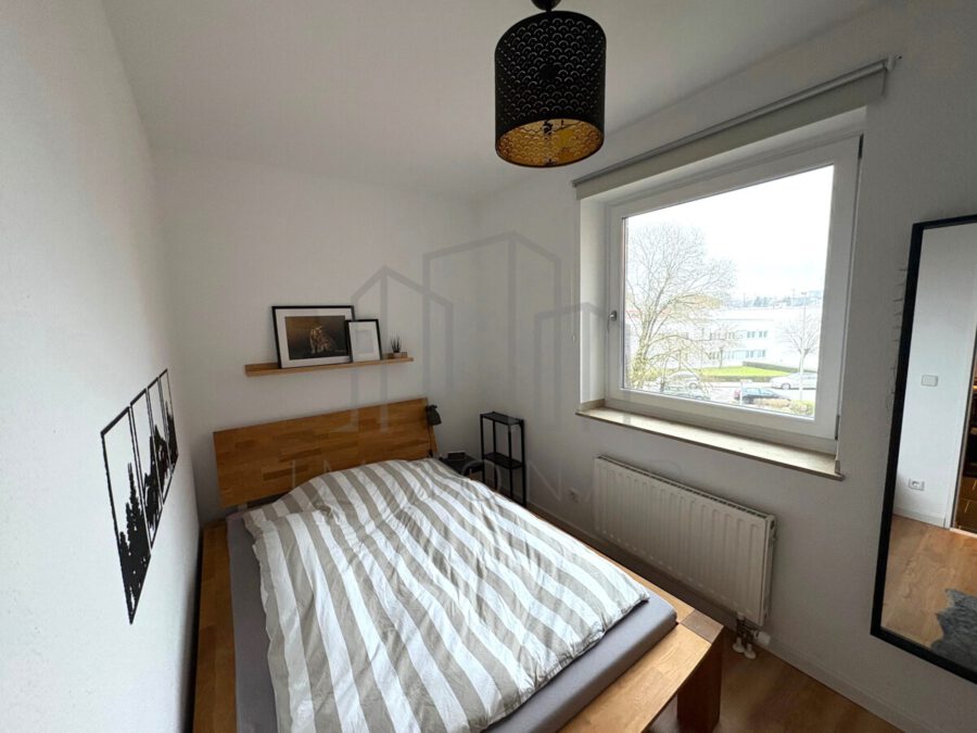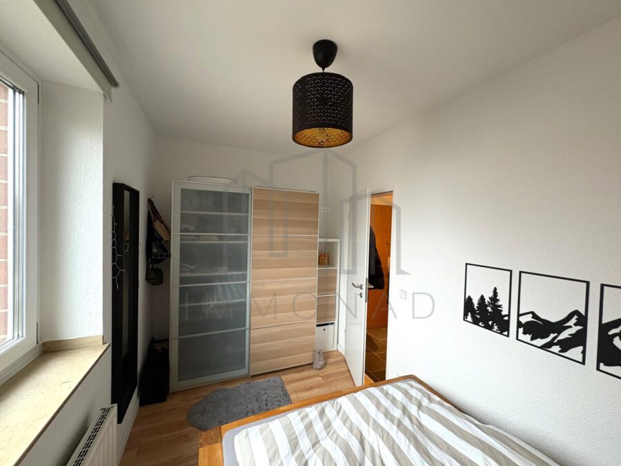 Das separate Schlafzimmer verfügt ebenfalls über ein großes Fenster und bietet ausreichend Platz für ein Bett sowie einen Kleiderschrank.