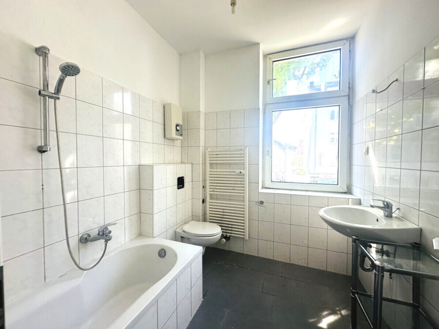 Das Tageslichtbad ist funktional ausgestattet mit Badewanne inklusive Duschmöglichkeit, Waschbecken, WC sowie einem Handtuchheizkörper.