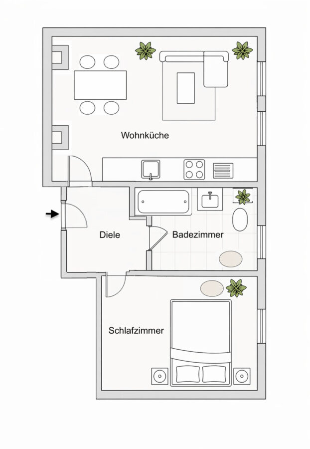 - 2 Zimmer (Wohnküche + Schlafzimmer)