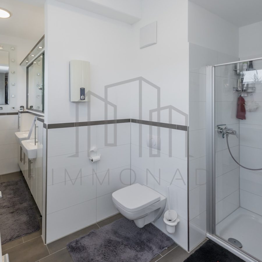Bad 1: Doppelwaschbecken, Dusche, WC