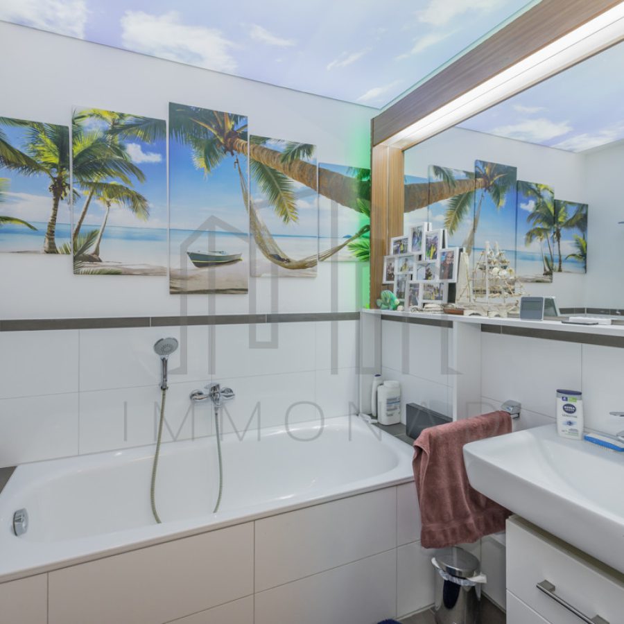 Bad 2: Waschbecken, Badewanne, WC, moderne Spanndecke mit Beleuchtung